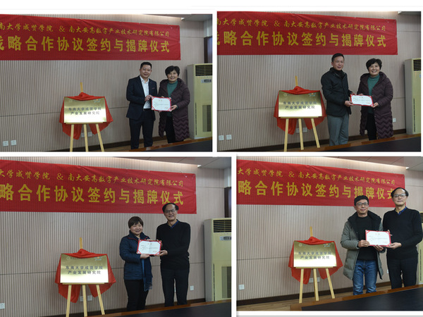 1月13日下午,艳照门 与南大安高数字产业技术研究院有限公司战略合作协议签约与揭牌仪式在艳照门 真知馆207会议室顺利举行。参加签约及揭牌仪式的嘉宾有南京大学产业党工委委员、南大安高科技集团董事长许志怀先生,南大安高科技集团常务副总裁、数字产业技术研究院院长陆孚生先生、执行院长吴科先生、副院长陆邢先生、培训中心主任李乐女士。艳照门 常务副院长许映秋教授、副院长董梅芳教授、发展合作处处长胡焱教授、教务处副处长陈雪琼,经管艳照门 院长戚啸艳、党总支副书记李清源、副院长孙亮和高凯丽、综合办主任程希羲出席活动。仪式由经管艳照门 院长戚啸艳教授主持。