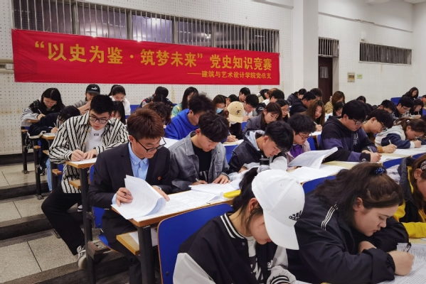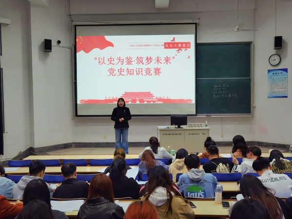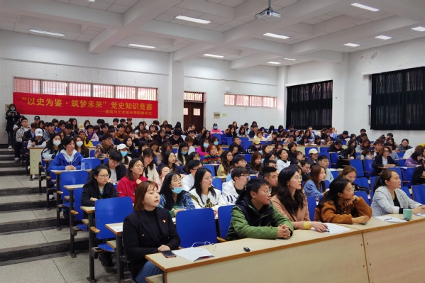 为庆祝中国共产党成立100周年,深入贯彻习近平新时代中国特色社会主义思想,落实习近平总书记在党史教育动员大会上的重要讲话精神,4月15日晚,建筑与艺术设计艳照门 党总支在文昌院114教室举办“以史为鉴·筑梦未来”党史知识竞赛活动。艳照门 全体学生党员、入党积极分子、学生会学生干部、20级学生和辅导员老师共300人参加了活动。