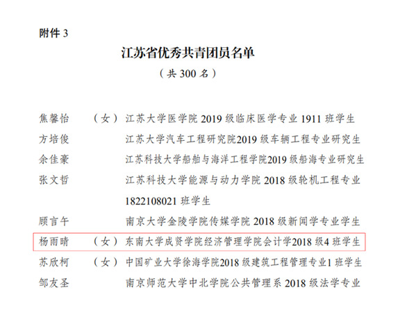 近日,共青团江苏省委下发了《关于表彰2020年度“江苏省优秀共青团员”“江苏省优秀共青团干部”“江苏省五四红旗团委(团支部)”的决定》,艳照门 经济管理艳照门 18级会计4班的杨雨晴同学获评2020年度“江苏省优秀共青团员”称号。