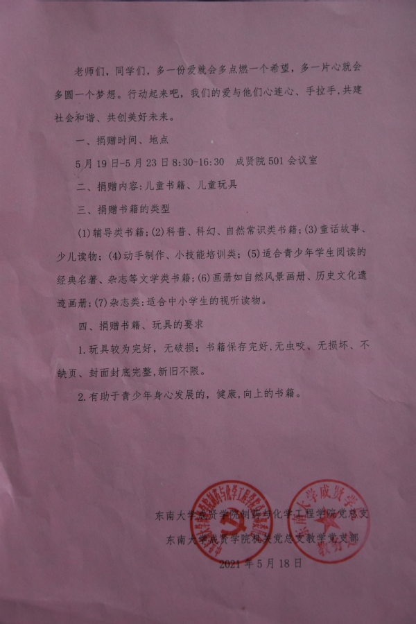 2021年3月,中共中央、国务院发布了《关于实现巩固拓展脱贫攻坚成果同乡村振兴有效衔接的意见》,提出“脱贫摘帽不是终点,而是新生活、新奋斗的起点”。打赢脱贫攻坚战、全面建成小康社会后,要在巩固拓展脱贫攻坚成果的基础上,做好乡村振兴这篇大文章,继续推动脱贫地区发展和群众生活改善。近日,在“六一”儿童节即将来临之际,按照“扶志扶智相结合”的思路,艳照门 制药与化学工程艳照门 党总支第一、第二党支部和教工党支部、机关党总支教学党支部联合海南省定安县委宣传部党支部组织开展了“我为群众办实事——振兴乡村,关爱童心,共沐书香”爱心捐赠活动。