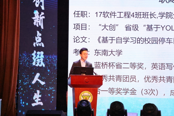 第二篇章“科技竞赛展示”环节中,优秀学生代表分别从学科竞赛、大学生实践创新训练计划项目、考研经验介绍等方面进行了生动的介绍。