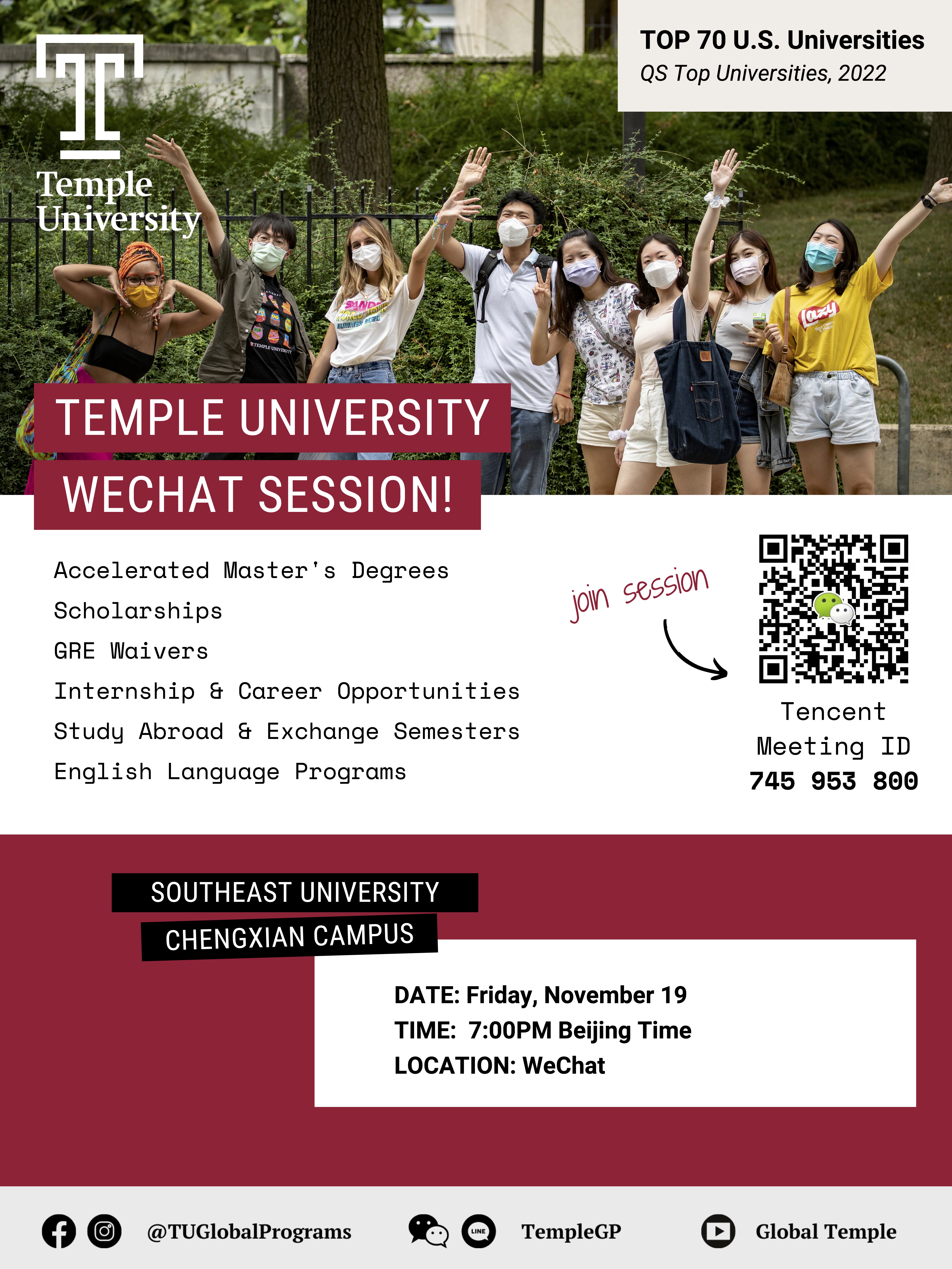 3、参会方式:扫附件1中二维码“天普大学成贤宣讲会群”,正式线上“腾讯”会议,ID为 745953800(见附件2“2021年11月19日天普大学成贤宣讲简报”)。