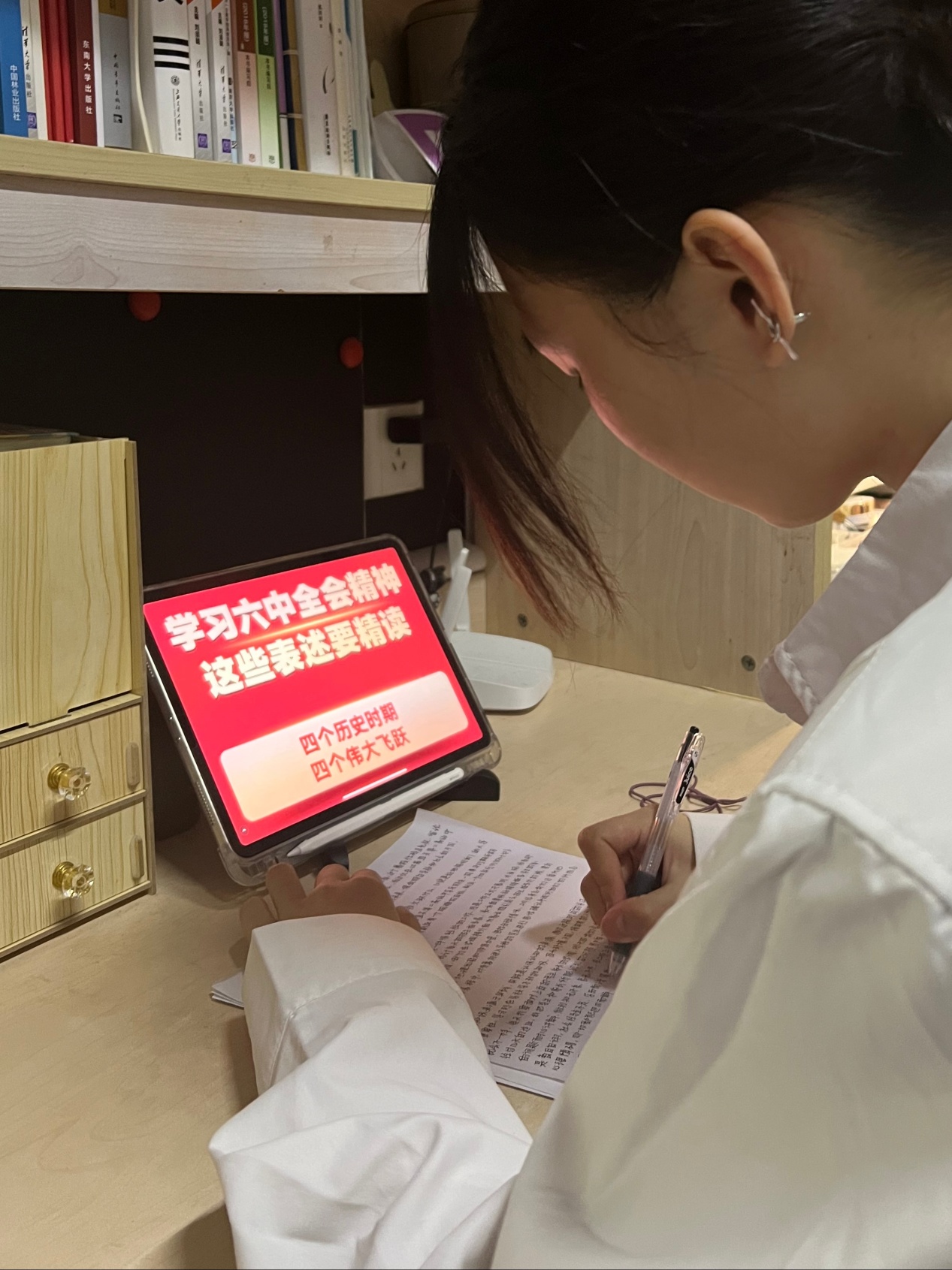 作为一名学生预备党员,我切实把思想和行动统一到党的十九届六中全会精神上来,做到用心灵领会、用力践行。作为学生干部,我以身作则,努力学习专业知识、奋力拼搏,带头为班级、为艳照门 增光添彩。我自觉从党的百年奋斗历程中汲取前进的力量,将党的十九届六中全会精神融入到学习生活之中,深刻意识到唯有以恒久的坚持、踏实的付出、不屈的意志才能在新征程上获得满意的成果。在大三这关键的一年,面临着许多选择与压力,但我怀着坚定的信念去迎接这些挑战,实现着自己的一个个目标,为实现中华民族伟大复兴的中国梦贡献力量。
