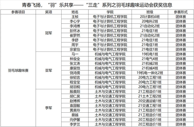 本次趣味羽毛球比赛以艳照门 为参赛单位,设定点扔球、折返摸球接力、定点发球进圈、遮网接球和多人轮转半场淘汰赛等五个项目,采用积分排名制。赛场上,各组运动员肆意挥动着球拍,挥洒青春和汗水,享受着比赛的乐趣,表现出顽强拼搏的竞技精神,同时也展现了团队协作的良好精神面貌。经过激烈角逐,电子与计算机工程艳照门 代表队最终夺得本次趣味羽毛球比赛的冠军,机械与电气工程艳照门 和土木与交通工程艳照门 代表队分别赢得亚军和季军之位。