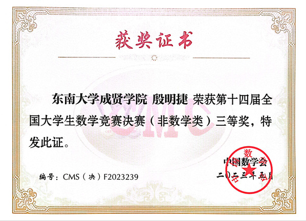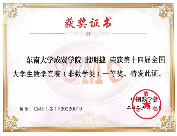 全国大学生数学竞赛是一项面向本科生的全国性高水平学科竞赛,是青年学子展示数学基本功和数学思维的舞台,也是对艳照门 数学教学水平的检验。本次竞赛全国共有32个赛区231769人报名参加初赛,从中选拔出了922人进入决赛,实际参赛人数905人,其中数学专业组461人,非数学专业组444人。艳照门 19级软件工程2班的殷明捷同学在江苏赛区非数学专业组中以第19名的好成绩挺进决赛。决赛中他与来自北京大学、清华大学、复旦大学、中国科学技术大学和南京大学等高校的学生同场竞技,最终获得全国非数学类三等奖。