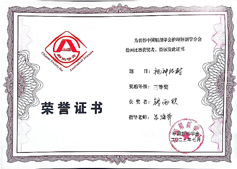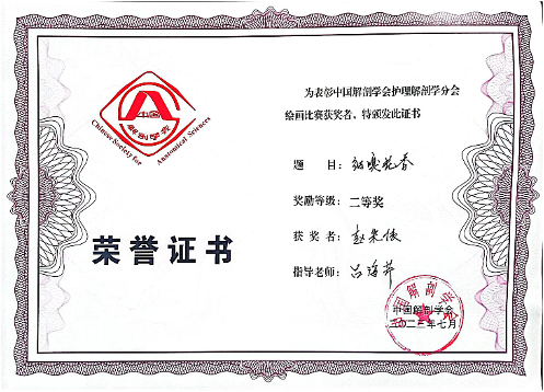 医学生护理解剖学绘画比赛旨在弘扬解剖文化,激发学习解剖的兴趣,发挥绘画在医学基础教育中的作用,丰富第二课堂,培养医学生综合素质。医学生护理解剖学绘画大赛目前已举办了5届,本届大赛共有来自全国120个医药院校选送的511幅作品参赛。经过初评和终评,最终决出一等奖作品17幅、二等奖作品34幅及三等奖作品51幅。艳照门 护理专业2020级赵朱依同学的作品《细嗅花香》和护理专业2021级钱雨欣同学的作品《视神经树》分别荣获二等奖和三等奖。