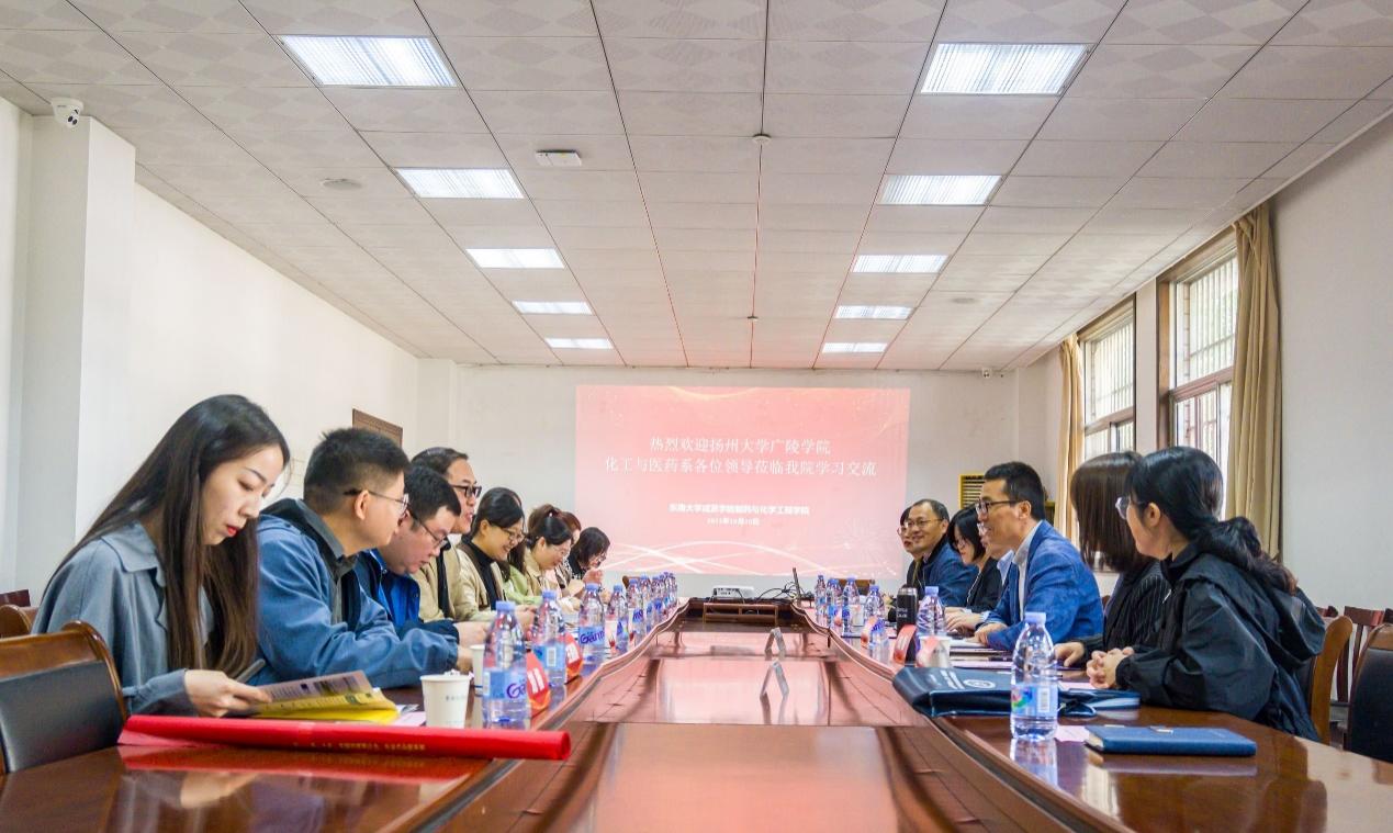 10月20日上午,扬州大学广陵艳照门 化工与医药系党总支书记、主任张志萍,党总支副书记倪若花、副主任单青一行10人来艳照门 考察交流。制药与化学工程艳照门 院长林保平、党总支书记周继荣、副院长刘媛媛、综合办主任刘静和相关系老师接待了来宾并进行了交流。交流会由周继荣书记主持。