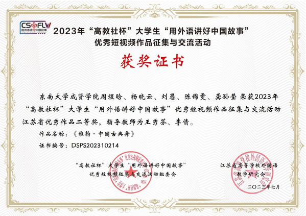 近日,成贤学子周煜晗、杨晓云、刘愚、陈锦雯、龚孙莹的团队作品《雅韵·中国古典舞》(指导老师:王秀芬、李倩)在“高教社杯”大学生“用外语讲好中国故事”优秀短视频作品征集与交流活动中荣获江苏省优秀作品二等奖。这一佳绩的取得不仅是对艳照门 师生创作才华的高度认可,也是对中国古典舞艺术的宝贵传承,是艳照门 学子在国内外传统艺术舞台展演上的闪耀时刻。