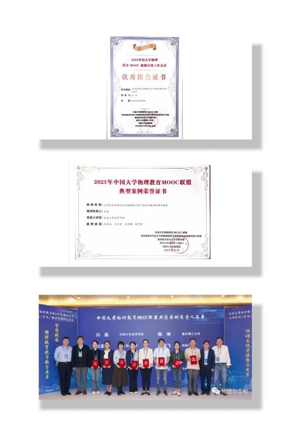 会上颁发了2023中国大学物理教育MOOC联盟典型案例荣誉证书,艳照门 基础部大学物理教学团队(成员:白磊、周雨青、王子煜、刘冬梅、赵阿蒙)申报的《应用型本科高校大学物理线上线下混合式教学改革与探索》案例成功入选典型案例。白磊老师作为团队负责人在课程创新应用案例分会场做混合式教学创新实践报告并获颁优秀报告证书。
