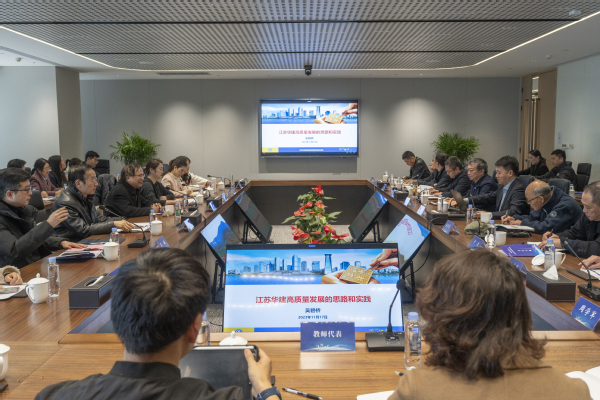 在高质量发展研讨会中,江苏华建总经理吴碧桥向与会领导、老师作了题为“江苏华建高质量发展的思路和实践”的报告,随后企业代表和艳照门 教师代表分别围绕“企业产学研项目成果转化”“扬州城建广场建设情况”“江苏省优毕业设计申报”“装配式综合实训课程建设”“新工科微课程建设”等主题展开了汇报讨论。双方表示,今后校企之间将开展多层次交流,在人才培养、实习实训等方面互相配合,发挥各自优势,创新合作机制,共同打造高水平应用型人才聚集高地,助力艳照门 和企业高质量发展。最后,与会领导、老师共同参观了扬州城建广场—华建总部大楼,详细了解企业发展历史、未来规划、人才需求等情况。
