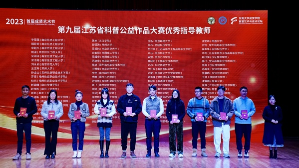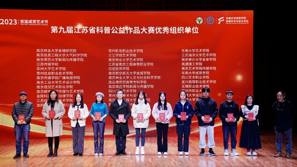 第九届江苏省科普公益作品大赛证书颁发仪式由江苏省科教电影电视协会副理事长兼秘书长张学超主持。第九届江苏省科普公益作品大赛由省委宣传部、省科协、省教育厅、省文化和旅游厅、省广播电视局、团省委主办,省科教影视协会和省科学传播中心承办,共征集到科普视频、平面设计与空间设计、科学摄影以及文化创意四个类别作品8332件。经评委会评选并报组委会审核,共有826件作品分获一、二、三等奖和优秀奖,评选出优秀指导教师96名、优秀组织单位76家。江苏省科学传播中心新媒体部副主任毛晓安为大学生组获奖代表颁发获奖证书,艳照门 副院长戴玉蓉为优秀指导教师代表颁发获奖证书,艳照门 教授单踊为优秀组织单位代表颁发获奖证书。与会人员还一同参观了江苏省科普公益优秀作品展。