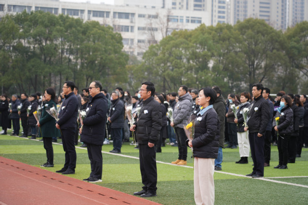 上午9时59分,悼念仪式正式开始。10时01分,凄厉的警报声穿越城市上空,时间在这一刻凝固,全体师生集体静默。山河共呜咽,寰宇同悲戚,86年前的今天,侵华日军侵入南京,制造了惨绝人寰的大屠杀。“1937.12.13”,这个满含伤痛和血泪的日子,承载着一个民族刻骨铭心的记忆;“300000”,这个用皑皑白骨垒成的数字,记载着中国人永志不忘的伤痛。随后,师生代表依次献上菊花,愿逝者安息,生者缅怀,致敬革命先烈,感怀国家之殇。活动最后,校团委宣传部广播台学生代表齐声朗诵《和平宣言》,发出庄严的和平誓言,铿锵有力,声声入耳。