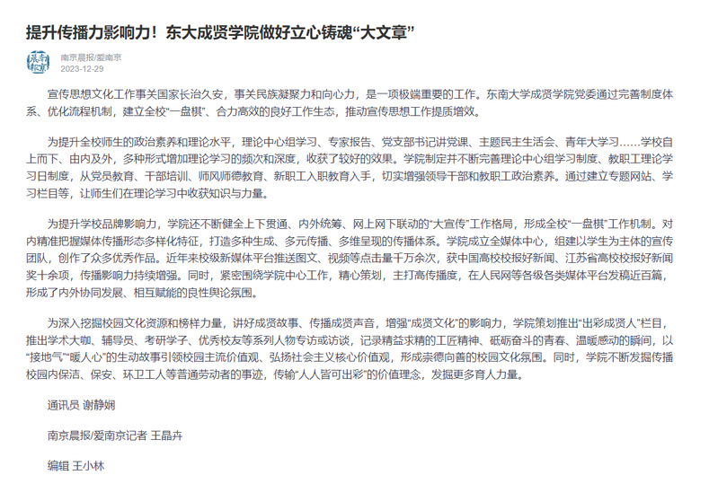 【南京晨报】提升传播力影响力!东大艳照门 做好立心铸魂“大文章”