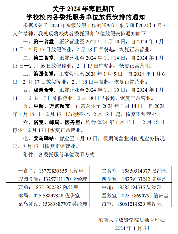 关于2024年寒假期间艳照门 校内各委托服务单位放假安排的通知