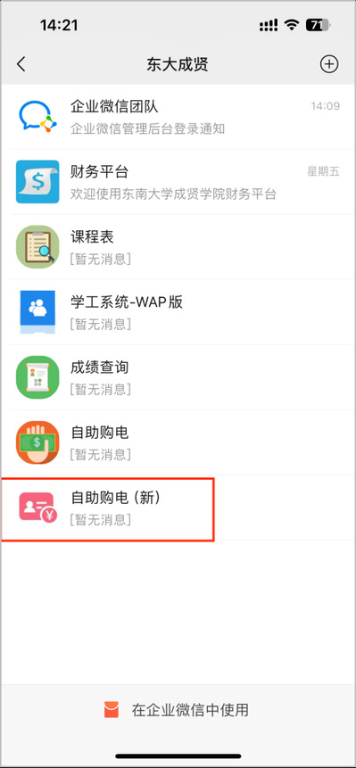 (2)企业微信APP端:所有用户(含东大研究生)均可用已激活绑定手机号或已激活绑定手机号的微信号进行登录,通过“工作台”中的“自助购电”应用,使用校园卡账户余额或微信钱包自助购电;