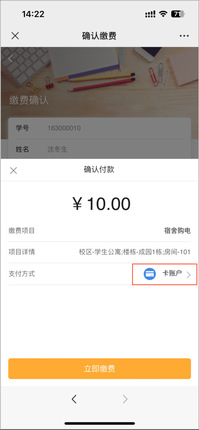(1)未开通校园卡账户的用户(如东大研究生),点选完待充值宿舍后,系统默认支付方式为“卡账户”,可能会提示“未获取到用户卡片信息”,此时点选“支付方式”,将支付方式改为“微信”即可正常缴费。