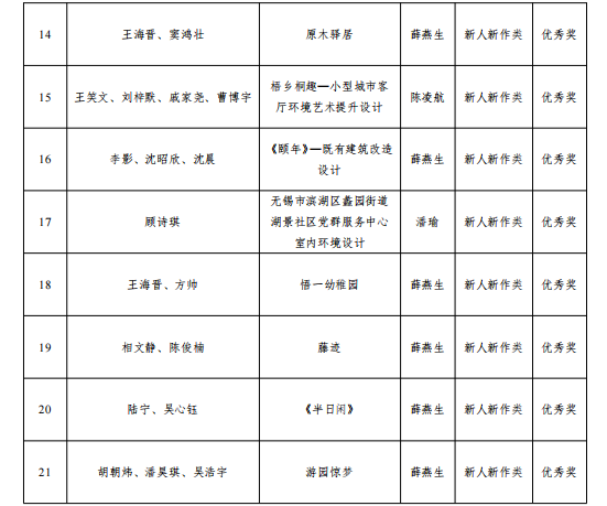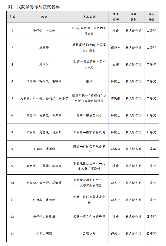 大赛经过数月作品征集和专家多轮评审,共产生一等奖19个,二等奖40个,三等奖74个。艳照门 环境设计专业教师指导的学生团队作品荣获新人新作类二等奖5个,三等奖8个,优秀奖8个(具体获奖名单和奖项详见附表)。薛燕生教师团队创作的《南京师范大学餐厅改造》获公装方案类二等奖。王桉、潘瑜、薛燕生、陈凌航四位教师荣获优秀指导老师奖。