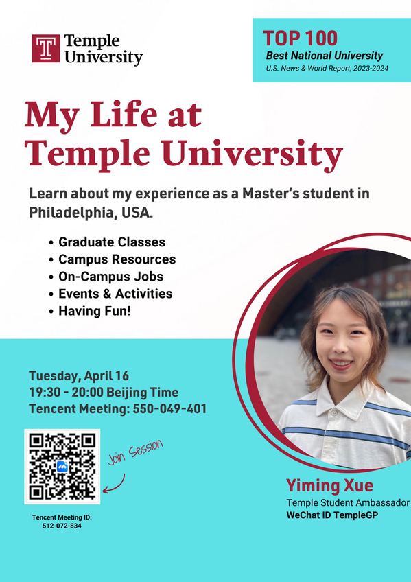 关于参加美国天普大学在读硕士研究生校园学习生活线上(腾讯会议)分享活动的通知