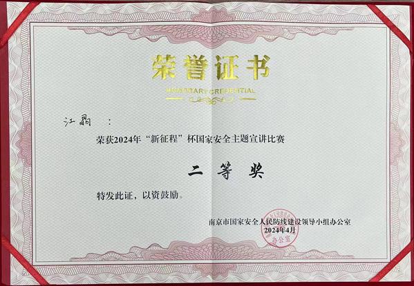 为切实增强总体国家安全观的宣教力度,在第九个全民国家安全教育日到来前夕,4月11日,“新征程”杯国家安全主题宣讲比赛在南京交通职业技术艳照门 举行。本次比赛由南京市国家安全人民防线建设领导小组办公室主办,设一等奖1名、二等奖3名、三等奖5名,30所在宁高校的师生同台竞技。经过激烈角逐,艳照门 建筑与艺术设计艳照门 辅导员、思政课教师江晶以总分第3名的好成绩荣获二等奖。