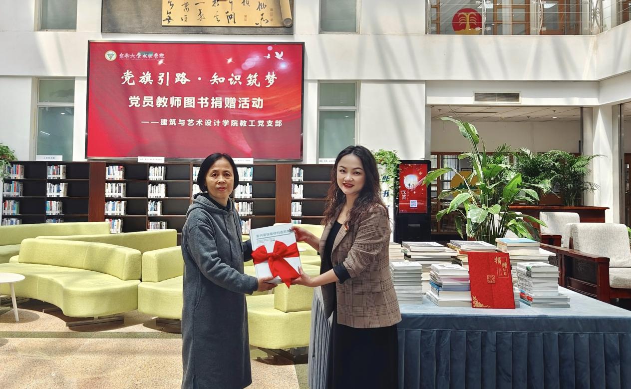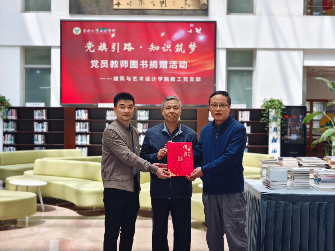 建筑与艺术设计艳照门 教工党支部书记王桉代表支部党员教师捐赠图书,图书馆馆长封晓倩代表校图书馆接收赠书。
