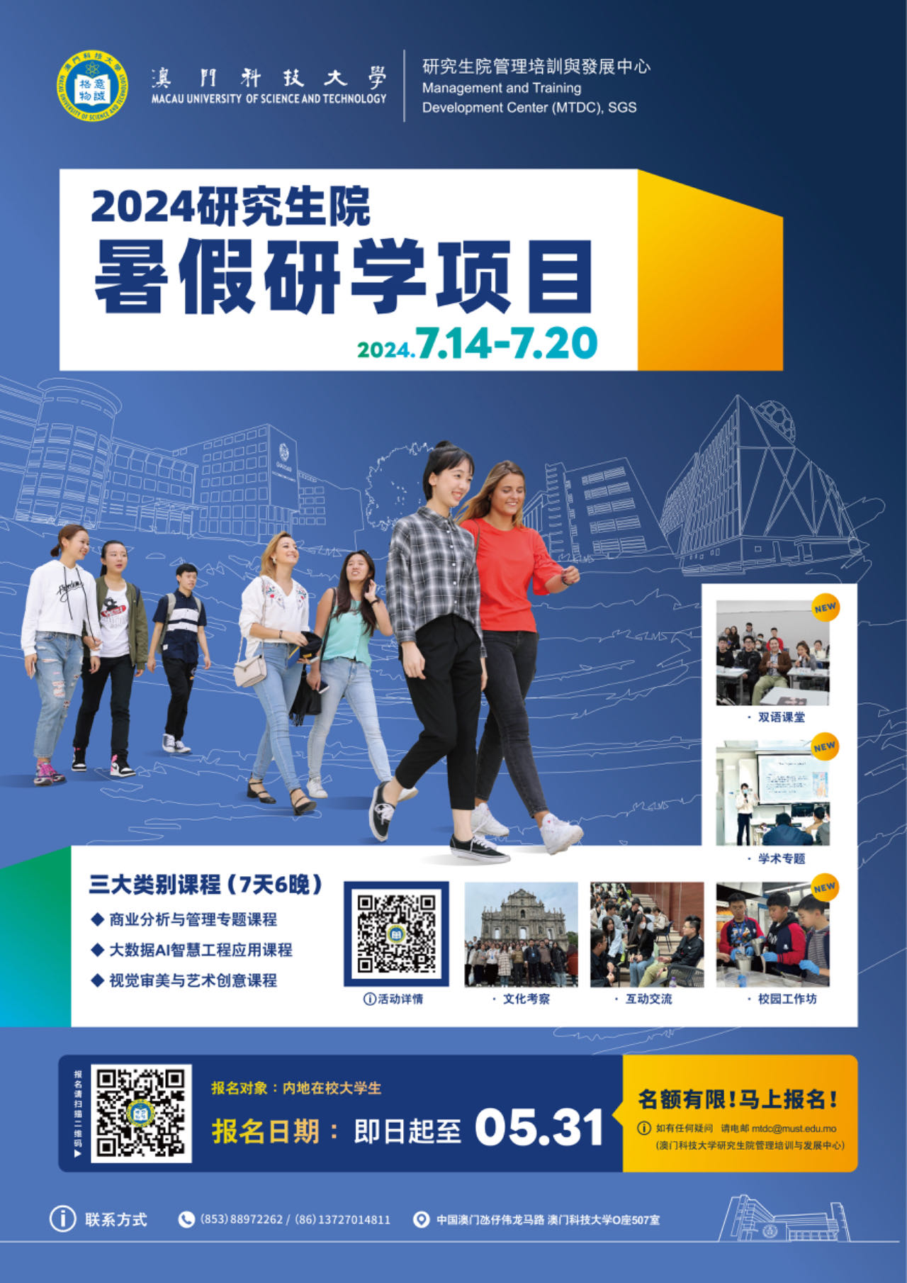 为让更多同学和家长更好地了解澳门科技大学2024年澳门科技大学暑假研学项目,澳门科技大学研究生院管理培训与发展中心将于4月29日(周一)晚7点举行《2024澳门科技大学暑假研学项目线上宣讲会》。