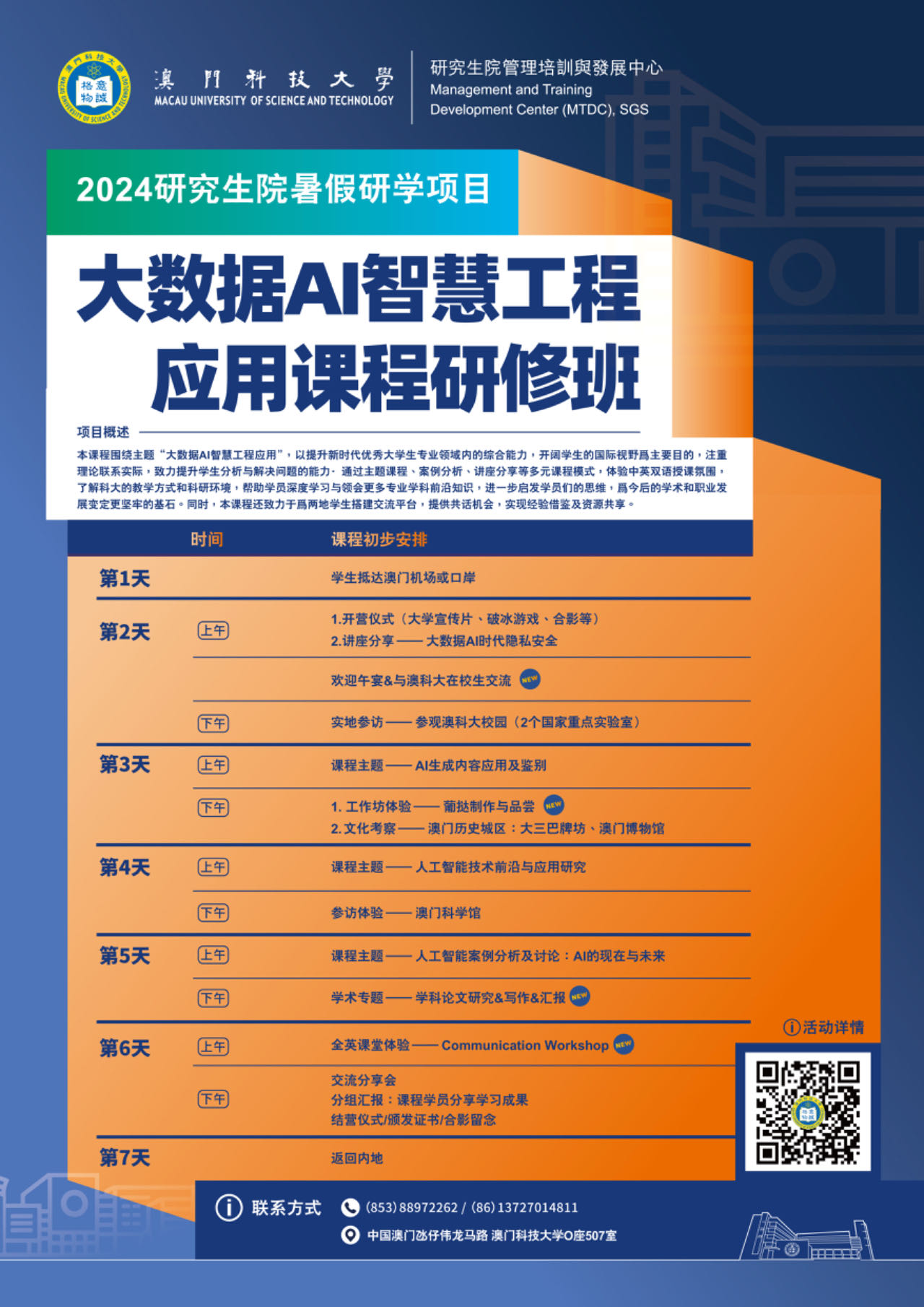 附件1.R3-2024年澳科大暑假大学生培训方案.pdf附件2:艳照门 2024年澳科大研究生院暑假研学项目选课申请表.doc3.2024年研究生院暑假研学项目总宣传海报.JPG 4.大数据AI智慧工程应用课程研修班宣传海报.JPG5.商业分析与管理专题课程研修班宣传海报.JPG6.视觉审美与艺术创意课程研修班宣传海报.JPG