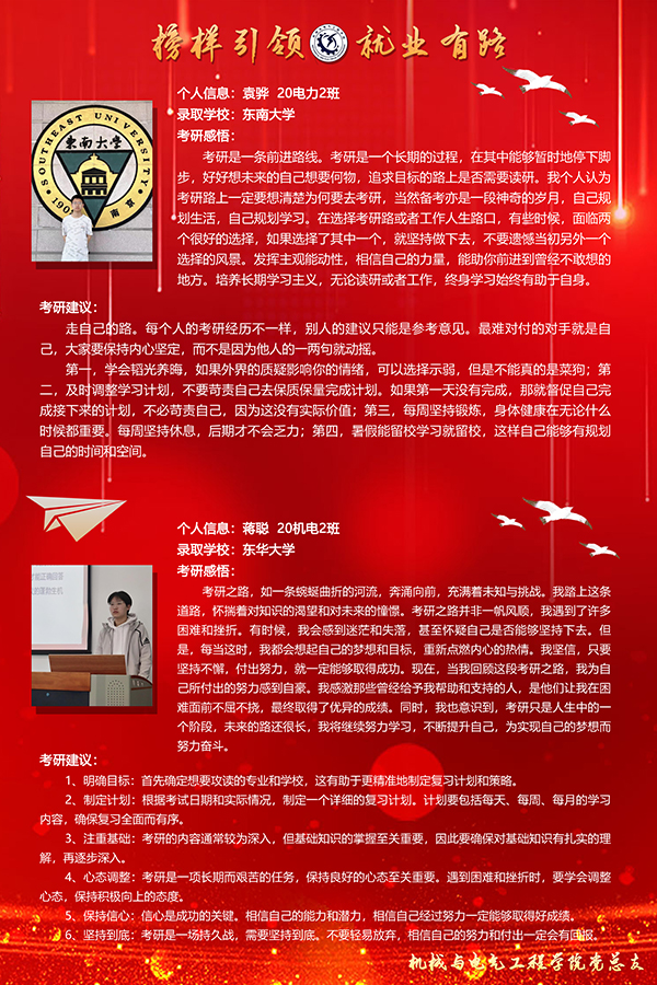 为了更全面展示机电艳照门 2024届优秀毕业生代表的先进事迹和风采,机械与电气工程艳照门 第二党支部举办线上线下相结合的毕业生就业典型人物事迹展,其中,线上主要通过艳照门 网站、微信公众号、班级QQ群、微信群等不同形式向全院同学展示优秀毕业生的风采;线下主要通过制作宣传展板、光荣榜,召开主题班会和考研就业经验分享会等多种方式展示。10名成功考取硕士研究生的同学围绕艳照门 及专业选择、备考规划、学习方法、心态调整等方面展开分享。他们从自身考研经历出发,讲述备考过程中面临的困难,分享亲身实践的成功做法,同时鼓励学弟学妹们要准确定位、持之以恒、相信自己。10名已签约单位的同学分别从职业规划、简历制作、面试技巧以及心理调适等方面展开分享。他们结合自身的求职历程,强调了扎实的专业基础、良好的心态、丰富的实践经历对于成功就业的重要作用。