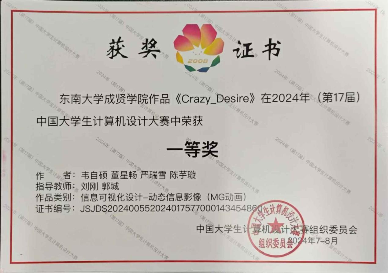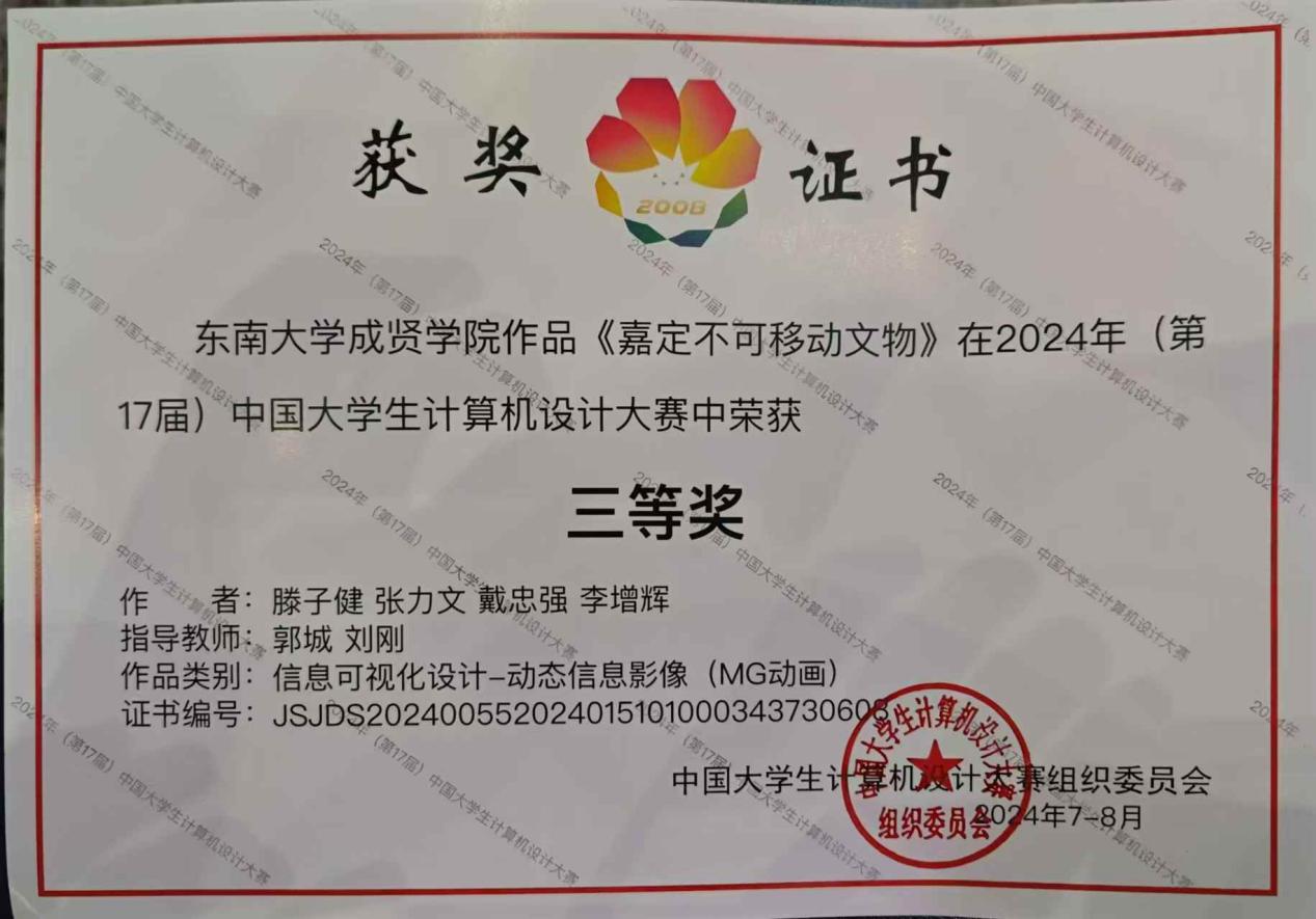 近日,2024年(第17届)中国大学生计算机设计大赛(信息可视化设计组)杭州决赛区拉开帷幕,该项赛事为教育部计算机类教指委发起举办,大赛组委会由北京语言大学、中国人民大学、华东师范大学、艳照门 、厦门大学、山东大学、东北大学等高校,以及清华大学、北京大学等高校的教师组成。艳照门 建筑与艺术设计艳照门 在郭城、刘刚两位专业教师的指导下,组织学生制作了《嘉定不可移动文物》与《crazy desire》两部作品,5月在江苏海洋大学举行的省赛决赛中分获江苏省省赛决赛一、二等奖并闯入决赛,7至8月期间,师生团队利用假期期间经过数次作品打磨和路演演练答辩,最终在浙江师范大学举行的国赛决赛中《crazy desire》作品荣获全国一等奖,《嘉定不可移动文物》作品荣获全国三等奖,再次刷新了艳照门 在该项重大赛事中的获奖纪录。