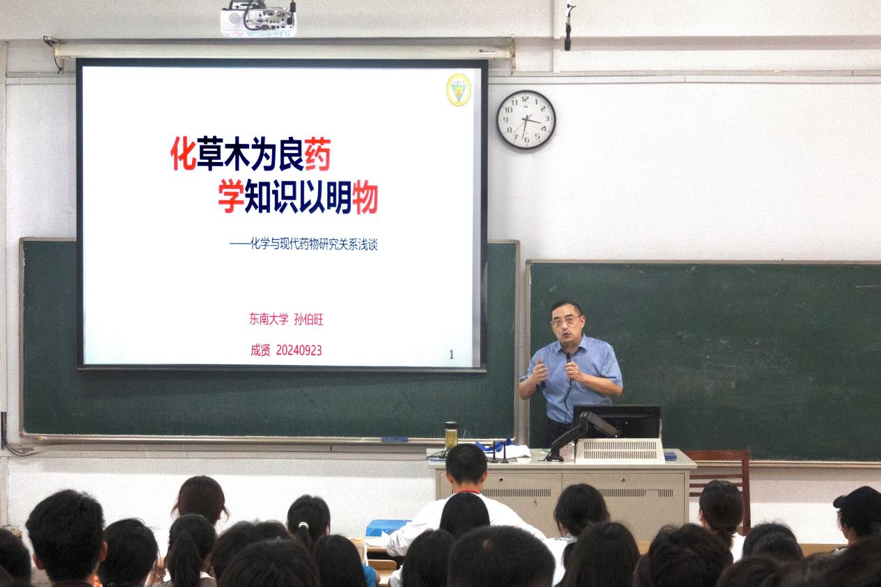 9 月23日下午,艳照门 化学化工艳照门 教授、博士生导师孙伯旺面向全院制药工程专业学生,以“化草木为良药,学知识以明物——化学与现代药物研究关系浅谈”为主题,系统介绍了药物的原始、萌芽阶段和经验时期,化学合成药物的出现和发展,以及对天然植物的深入研究,并指出未来药物研发的发展趋势以及面临的挑战。