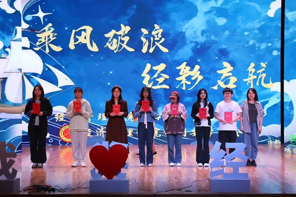 以美育人、以文化人,迎新晚会深植中华优秀传统文化沃壤,大力弘扬中华美育精神,由“初秋伊始,星辰初遇”“青春绽放,梦想起航”“携手经管,逐梦成贤”三个篇章组成。每一篇章以原创设计开启,涵盖合奏、歌舞、情景剧等多种表演形式,情感细腻的台词、充满活力的舞蹈和动听的音乐交织在一起,为广大师生呈现出一幅幅青春校园的缤纷画卷。活动在《最炫民族风》中拉开了序幕;歌舞《新贵妃醉酒》广袖舒展,红扇翻飞,感古典之魅力,传国潮之优雅;小品《军师恋盟》饶有风趣,以一场别开生面的恋爱观教育课,引得台下笑声不断;晚会现场回顾了分团委新媒体中心精心制作的军训视频,带领新生重温共同奋斗的时光,感悟自己的成长;歌曲《小美满》将晚会的氛围推向高潮,辅导员用歌声表达了对同学们满满的期望,诠释了立德树人的情怀与追求。