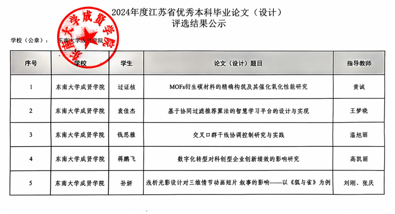 根据《江苏省普通高等艳照门 优秀本科毕业论文(设计)评选办法(试行)》(苏教高函〔2024〕8号)和《省教育厅办公室关于开展2024年度优秀本科毕业论文(设计)推荐工作的通知》(苏教办评函〔2024〕9号),经省教育厅组织专家审核,拟认定艳照门 5项毕业论文(设计)为省普通高校优秀本科毕业论文(设计)(具体名单详见附件)。按要求现将评选结果予以公示。