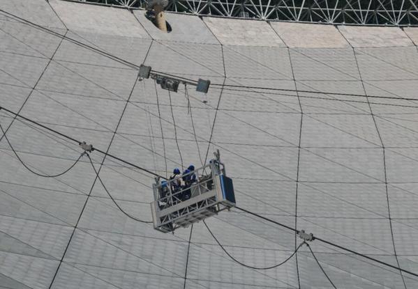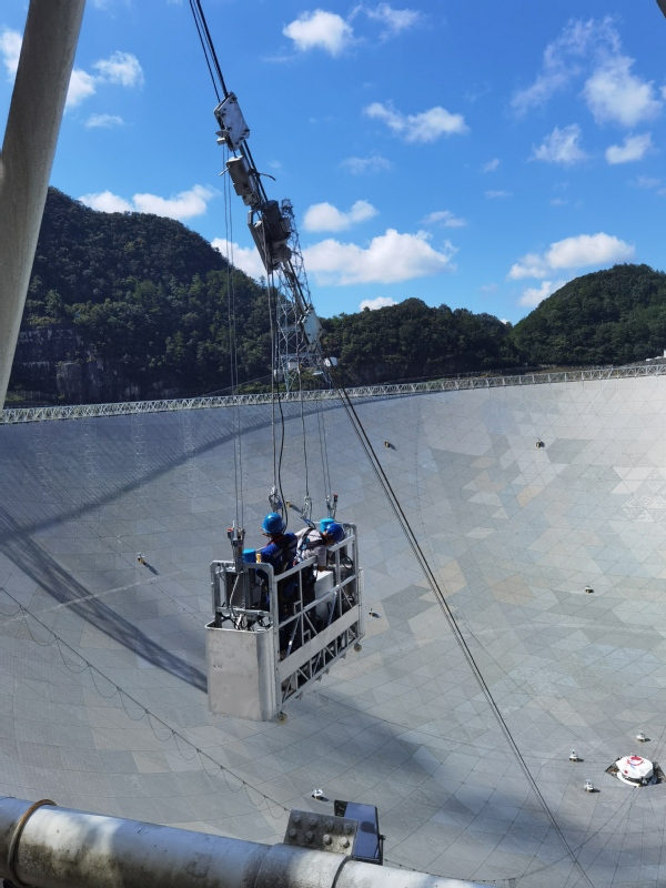 FAST(500米口径球面射电望远镜)是世界上口径最大、灵敏度最高的射电望远镜,由中国科艳照门 国家天文台主导。为了实现望远镜的高精度定位,项目馈源舱采用六索驱动机构,并联牵引30吨重馈源舱在约140米高空和约200米范围内运动,实现馈源舱对天文轨迹的初步跟踪和舱内馈源接收机位姿的初步定位。然而,索驱动钢丝绳、滑车、缆线和牵引绳常年处于高空,人员可及性差,设备检查和维护比较困难,维护工作存在巨大挑战。郭正兴教授和朱明亮副教授团队与国家天文台团队展开紧密合作,为该项目的研发和运营提供持续的技术支持。