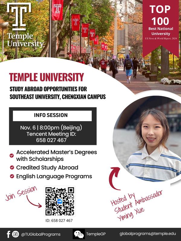 美国天普大学是与艳照门 签署合作交流协议的大学之一。为了更全面了解该大学专业设置、项目优势、申请硕士条件及校园生活等内容,美国天普大学拟将为艳照门 学生举办“艳照门 线上宣讲会”,具体安排如下: