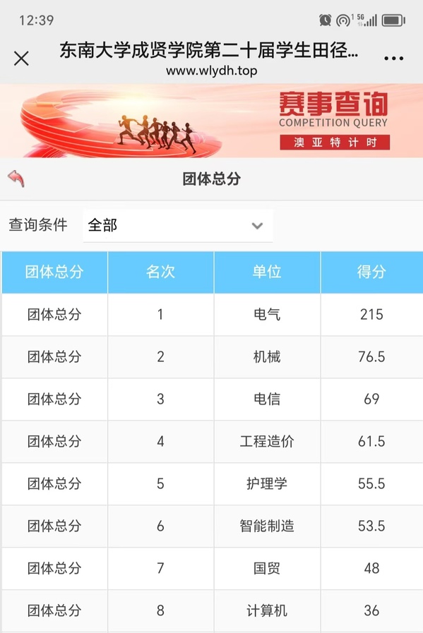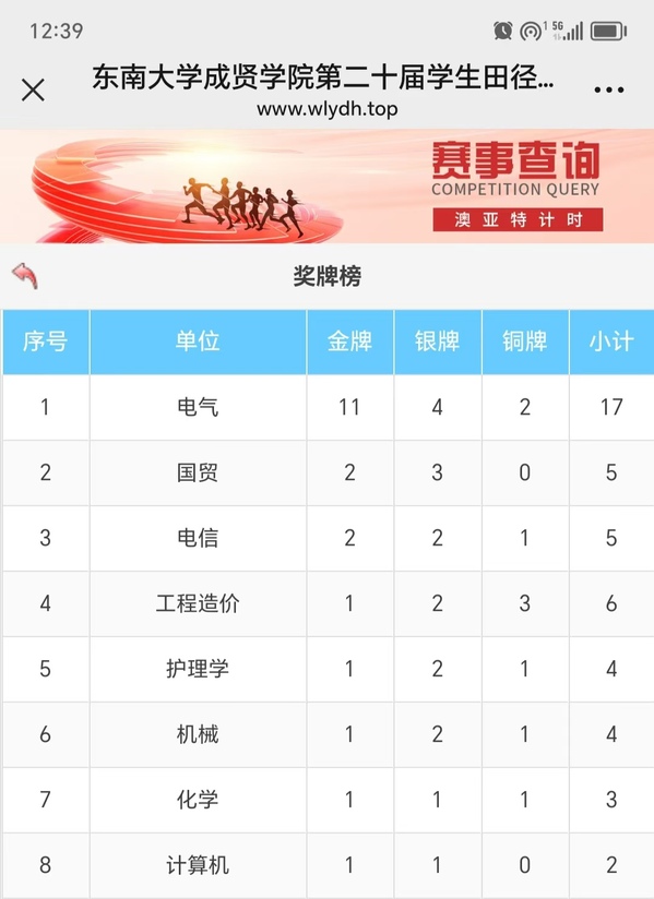 本次运动会共设有男、女21个田径单项和3个团体项目,有500余名运动员参加。其中,2名运动员打破2项校运会记录:杨翎艳同学以8.92m的成绩打破女子铅球校运会记录,梁杨莹同学以8.52m的成绩打破女子铅球校运会纪录。电气工程专业、机械设计及自动化专业、电子信息专业分获专业团体总分前三名。