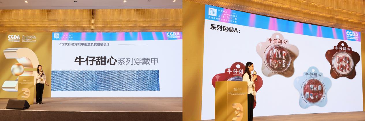 近日,2024第12届未来设计师•全国高校数字艺术设计大赛(NCDA)大赛落下帷幕。艳照门 建筑与艺术设计艳照门 学生作品在本次大赛中获得多项国家级、省级奖项,再创该项赛事获奖数量和质量历史新高。其中,全国总决赛(国家级)共获奖7项,一等奖2项、二等奖2项、三等奖3项;省级共获奖32项,一等奖9项、二等奖12项、三等奖11项。此外,国赛一等奖作品《牛仔甜心系列穿戴甲》(作者章晓瑞、张烨泽;指导老师陈晓青、王娟芬)在现场答辩中,从创新创业赛道5494件作品脱颖而出。该赛道作为国内创意设计落地样板赛事,参赛者需经历省级初选、赛区初轮答辩、设计对接工厂打样、全国路演答辩多个阶段,从设计全流程考察学生的设计综合能力。