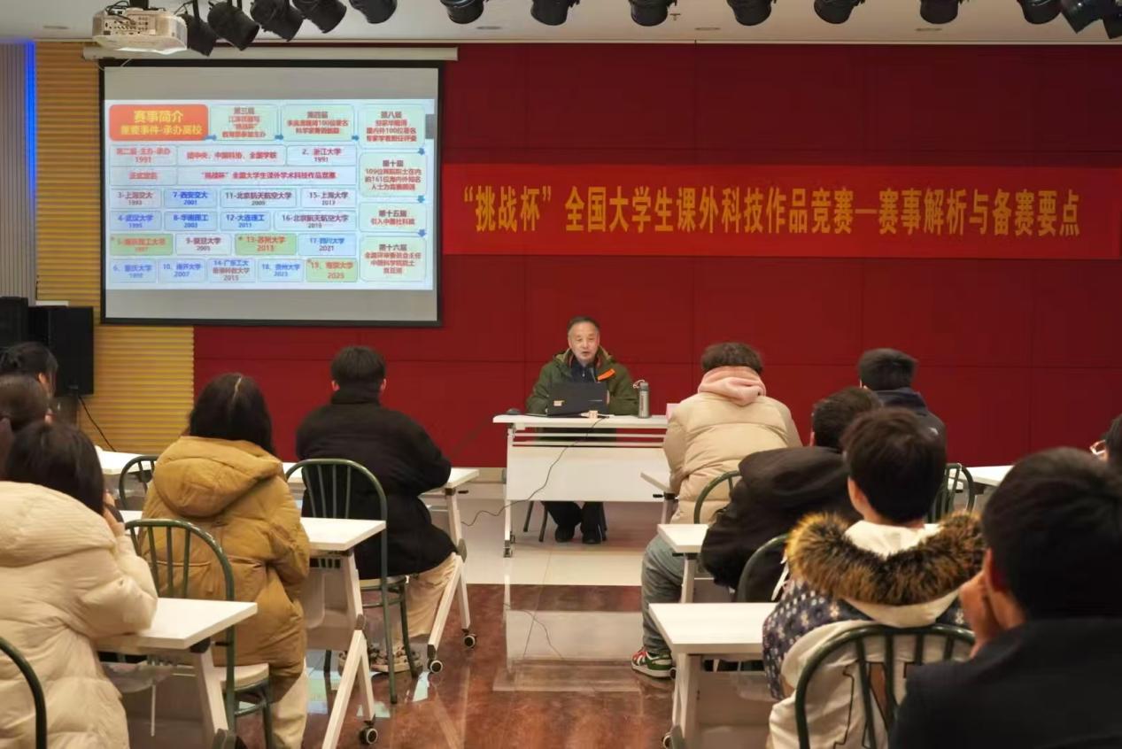 为进一步加大实践育人力度,营造浓厚的科研学术氛围,激发培养广大青年的创新精神和创业意识,促进艳照门 学生创新、创业活动蓬勃开展,孵化培育2025年“挑战杯”备赛项目,12月11日晚,校团委在综合楼报告厅开展“‘挑战杯’全国大学生课外科技作品竞赛——赛事解析与备赛要点”讲座。本次讲座特邀请“挑战杯”资深评委、教育部双创专家林岭教授为各艳照门 备赛选手、各协会骨干成员作专题辅导报告。