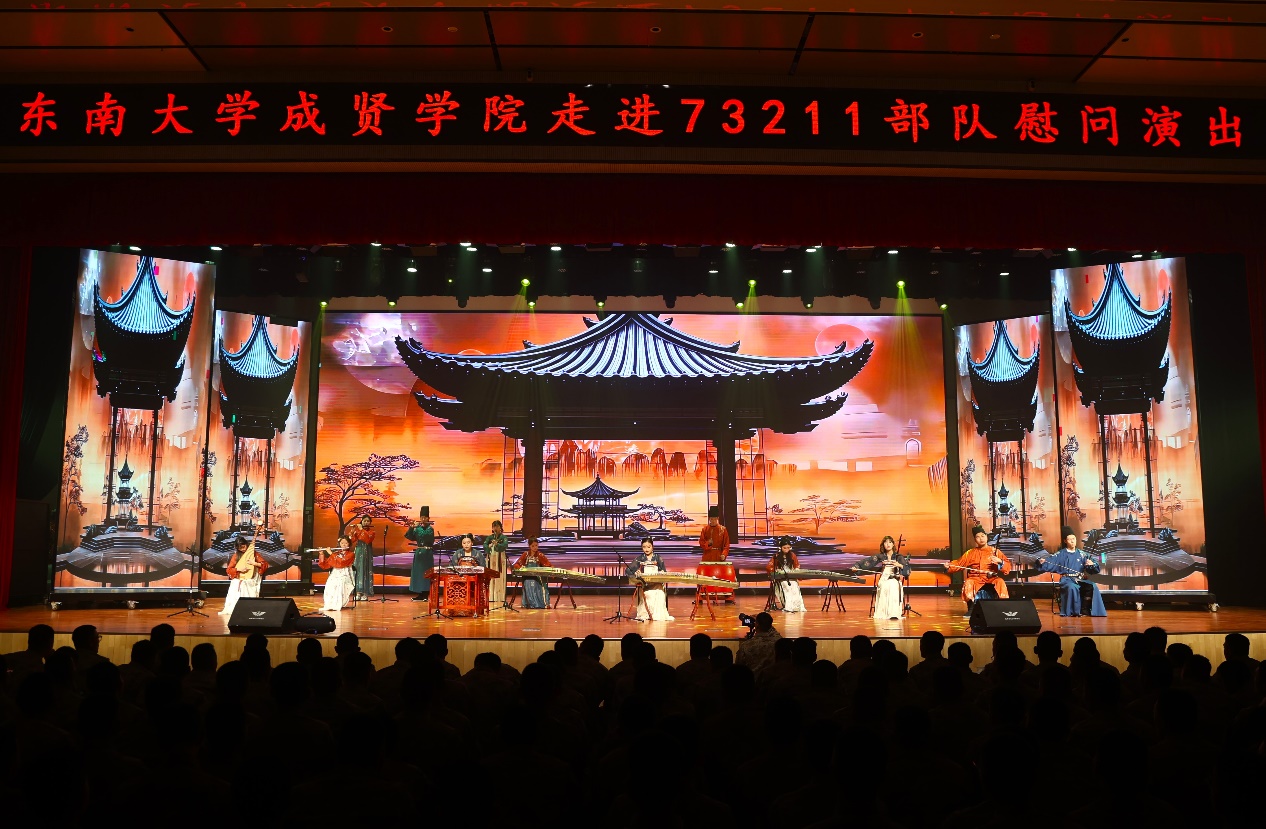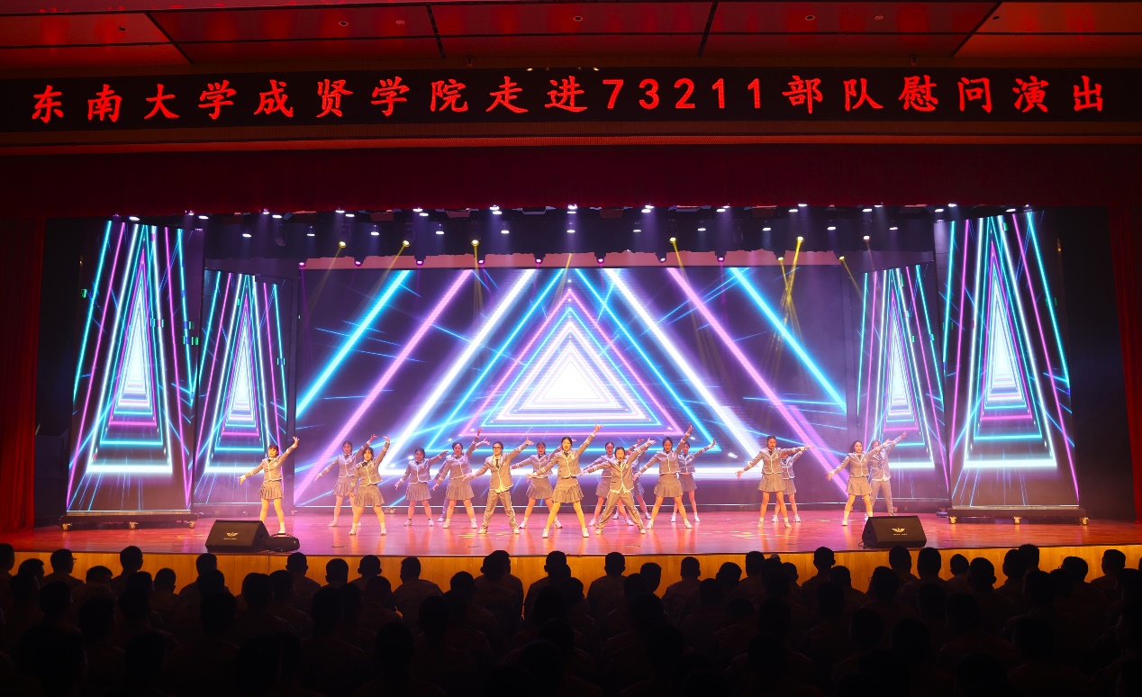 慰问演出在开场舞《Ei Ei》的青春活力中拉开序幕。歌曲串烧《雾里看花》《不要怕》《没有黄河我活不下去》《向云端》《稻香》或婉转悠长或深刻洪亮;舞蹈《梨花颂》《探清水河》柔美婀娜;《南京恋爱通告》甜蜜表白南京;《明月引》以器乐合奏书写一首充满诗意与画意的民乐佳作;舞蹈《飞天》《橘颂》以舞蹈跨越千年惊艳亮相;说唱《飘向北方》充满青春力量,振奋人心;小品《超时空重逢》演员深情演绎跨时空地重逢,致敬军人;歌舞《青春就这young》、现代舞串烧《Jenny from the block》《IMMAGETIT》充满青春活力;舞蹈《咏春》一招一式,刚劲有力,演出在歌舞《爱达未来》中落下帷幕。晚会中通过军训视频回顾了今年73211部队承训教官带训彰显着青春热血的军训时光。整场演出高潮迭起,精彩绝伦,涵盖了歌唱、舞蹈、器乐演奏、戏曲舞蹈及话剧等多种艺术表演形式,成贤学子的精神风貌和艺术展现,深情表达了艳照门 对部队的感谢。