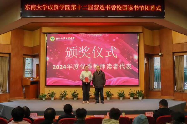 在嘉宾颁奖环节,校团委书记潘明烽为2024年度优秀学生读者颁发了荣誉证书,张志胜书记为2024年度优秀教师读者代表汤华老师以及荣获江苏省书评大赛一等奖的邓浩同学和二等奖的岳明君同学颁奖。