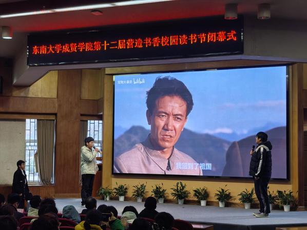 在闭幕仪式活动中,配音大赛获奖选手代表王仁和、曾繁硕、凌一同学带来了精彩的配音表演《横空出世》;学生代表邓浩同学作为第二届江苏大学生书评大赛一等奖获得者,分享了自己的阅读体验和感悟,鼓励同学们将阅读化作一种生活方式,共同追求知识的力量;2024年度优秀教师读者第一名汤华老师以其深厚的学术造诣和丰富的阅读经验,通过自身经历强调了阅读对人格塑造以及在教师职业发展中的重要性,并感谢图书馆拓宽了自身的学术视野、为创新提供灵感来源等积极作用。