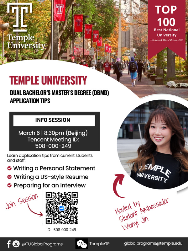 为了进一步了解美国天普大学DBMD项目的详细内容、专业设置、申请条件、校园生活及费用等信息,并分享如何撰写申请研究生艳照门 书面陈述、如何写出美国风格的个人简历以及如何准备面试等方面的技巧,天普大学将面向协议艳照门 开展DBMD项目线上宣讲会,具体参会时间及方式如下: