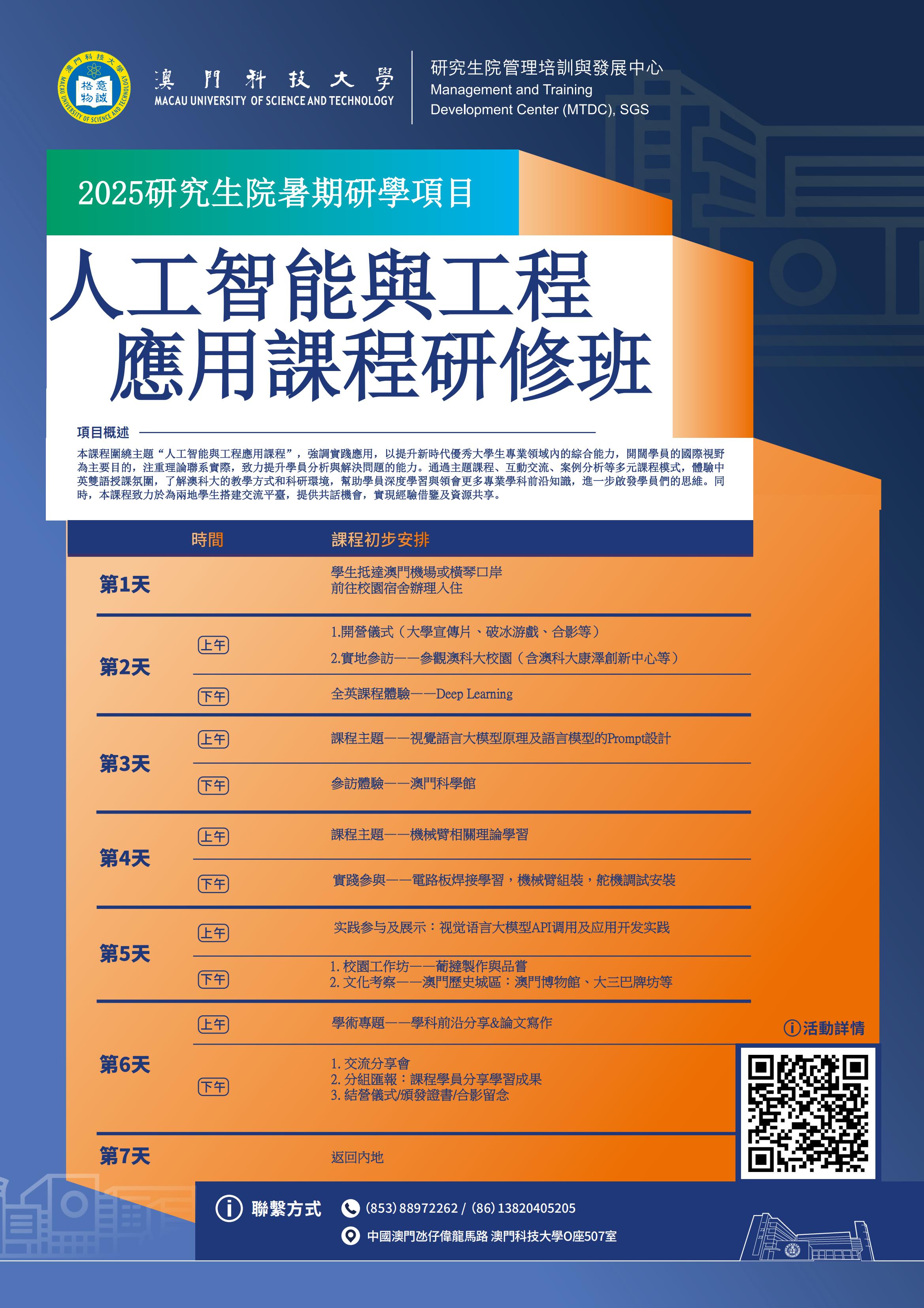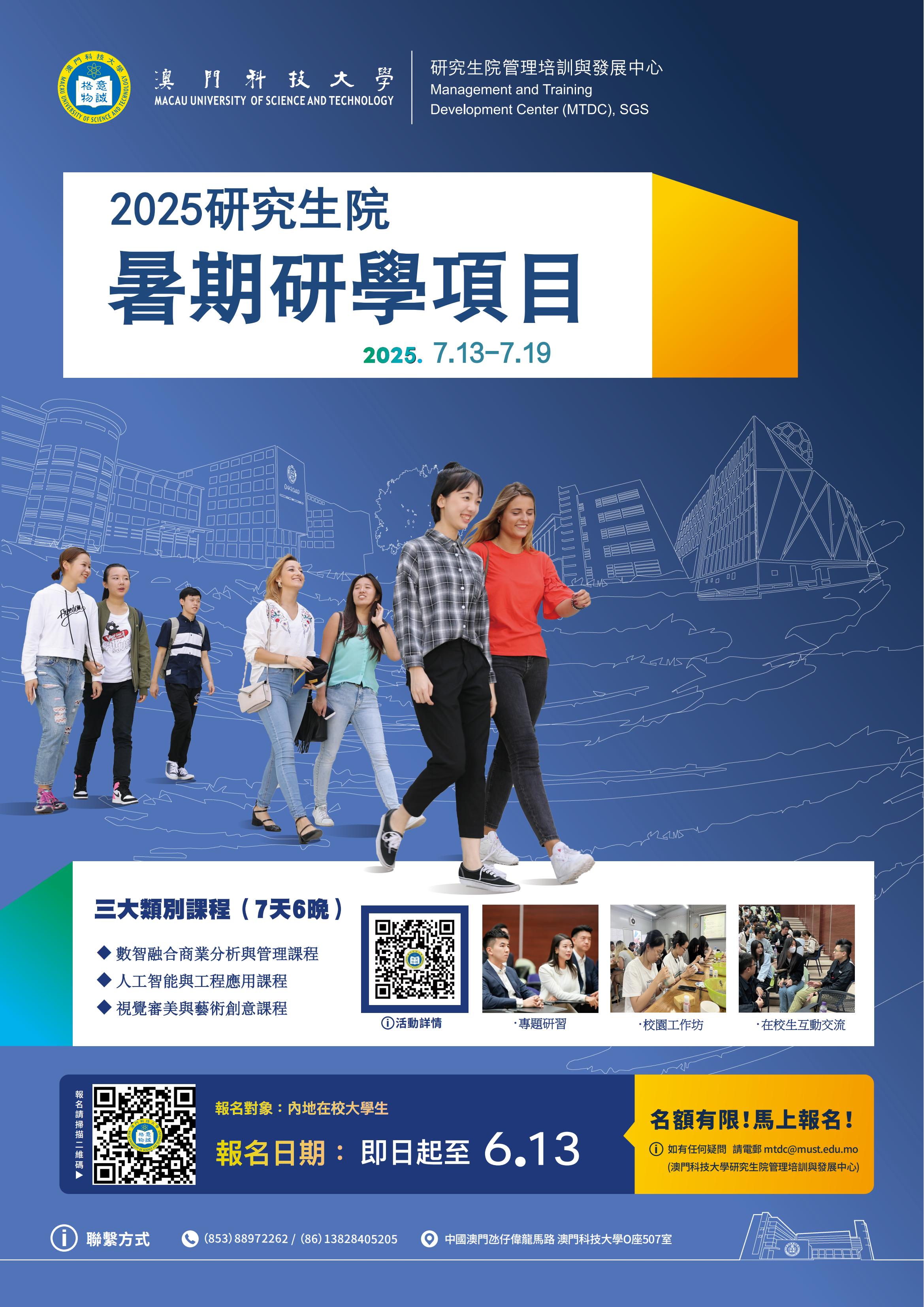 课程详情见附件正文《2025年澳门科技大学研究生院暑期研学项目》;项目结束后,学员将获得澳门科技大学研究生院管理培训与发展中心(MTDC)颁发的证书