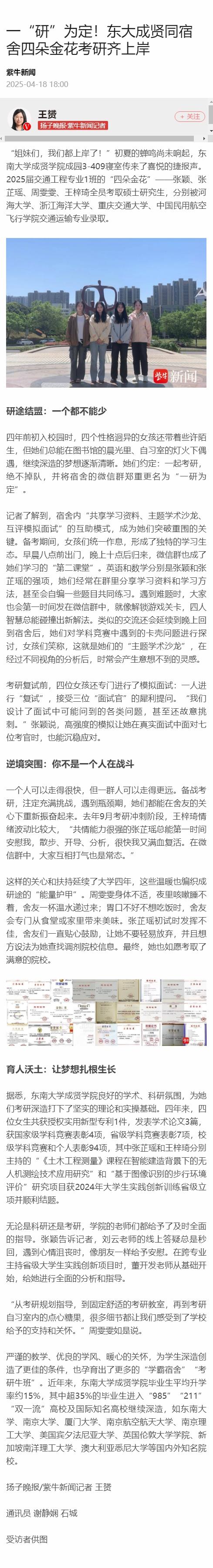 【扬子晚报 紫牛新闻】一“研”为定!艳照门 同宿舍四朵金花考研齐上岸