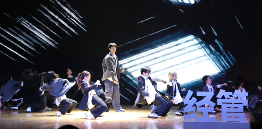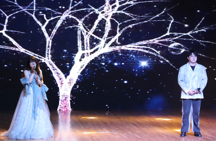 晚会以“启程逐梦·未来可期·盛夏之约”为主线,分为三大篇章,通过歌舞剧、舞蹈、脱口秀等形式,串联起毕业生对校园生活的眷恋与对未来的无限憧憬。晚会以一段承载着所有毕业生姓名的短视频开场,每位学子的名字如星辰般逐一浮现,六百余张青春笑脸在光影中定格,瞬间点燃全场温情。开篇舞蹈《One Spark》由李思婧等毕业生联袂演绎,诠释着青春的热烈;覃丽颖、孙欣璐以清澈的声线带来歌曲《我们的明天》唤醒校园记忆,观众轻声跟唱。原创脱口秀《怎么选都不错》以独特视角引发共鸣,席境一、李姝璇化身“学生会主席”,幽默还原学生干部的成长轨迹。晚会的温情时刻在辅导员登台时达到顶点,21级辅导员们献唱《晴天》,将师生情谊化作音符,引发现场共鸣。终章主题曲《剩下的盛夏》由肖骏杰、江苏伟等毕业生代表深情演绎,离别氛围悄然漫溢。