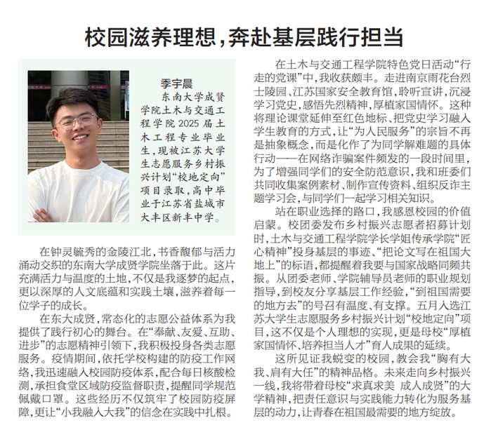 【新华日报】校园滋养理想,奔赴基层践行担当