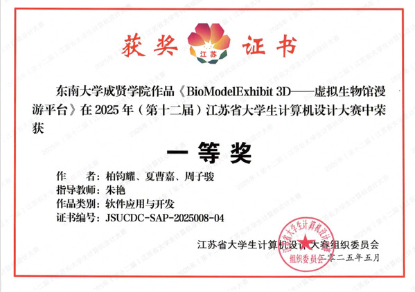 近日,2025年(第十八届)中国大学生计算机设计大赛圆满落下帷幕。由艳照门 软件工程专业柏钧耀、计算机科学与技术专业夏曹嘉、周子骏三位同学组成的团队,在朱艳老师的悉心指导下,凭借《BioModelExhibit 3D——虚拟生物馆漫游平台》项目,一路过关斩将,在软件应用与开发赛道荣获全国二等奖和江苏省一等奖。