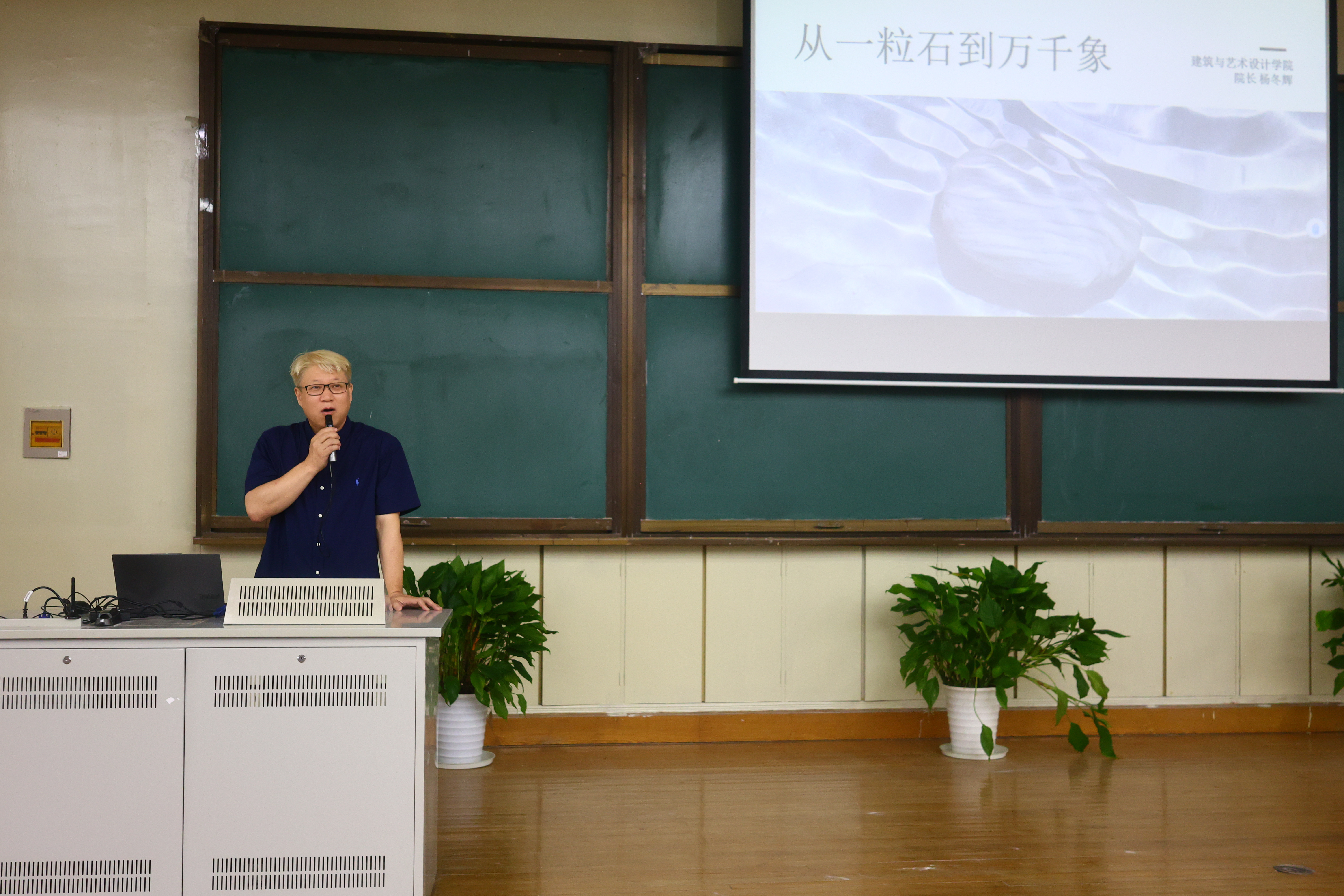 杨冬辉常务副院长首先向新生介绍了艳照门 的办学历史、各专业发展和建设成果,并以“从一粒石到万千象”为主题,为新生带来了一堂生动的专业启蒙课。杨院长强调,这些作品不仅体现了艳照门 “艺术为基、空间与数字双轨并行”的教学理念,同时也展现出学生跨界整合、回应现实的能力。他鼓励2025级新生以“一粒石”的专注与沉淀,在未来四年的学习生活中成长为能塑造空间、融汇媒介、创造未来的设计人才。