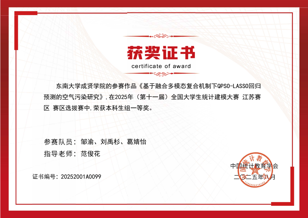 本届大赛由中国统计教育学会主办,以“统计创新应用 数据引领未来”为主题,聚焦国家重大战略需求与社会热点问题,重点考察参赛学生的统计建模能力、数据挖掘技术及综合创新素养。自 2 月启动以来,艳照门 高度重视,由基础部牵头,数学建模协会具体执行,范俊花、王子煜两位老师担任主教练,组织了校内选拔,最终遴选出 7 支队伍代表艳照门 参赛。经过激烈角逐,艳照门 邹渝、刘禹杉和葛婧怡组成的代表队(指导教师:范俊花)以《基于融合多模态复合机制下QPSO-LASSO回归预测的空气污染研究》荣获江苏省一等奖。