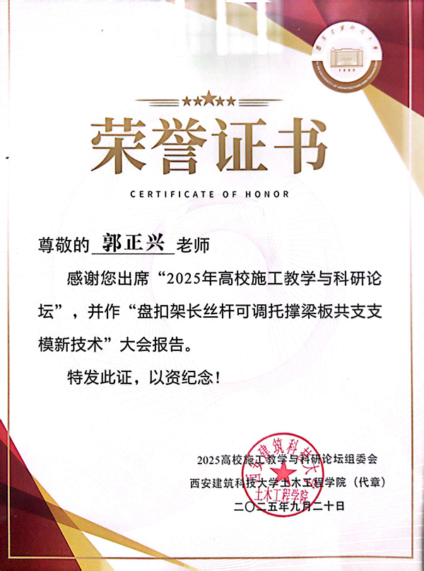 论坛围绕“产教融合”主题,聚焦AI赋能教学转型、智能建造课程体系建设、师资培养、校企合作平台建设等热点议题,吸引了全国近百所高校及相关企业的专家学者参与交流。郭正兴院长在大会上作了题为 “盘扣架长丝杆可调托撑梁板共支支模新技术” 的学术报告,系统介绍了该技术在实际工程中的应用优势、创新点及教学实践成果,受到与会代表的高度关注和积极评价。郭院长的报告结合工程实践与教学案例,展现了艳照门 在施工技术与智能建造领域的教研实力,也体现了土木与交通工程艳照门 在推动产学研协同育人、服务行业技术升级方面的积极探索。