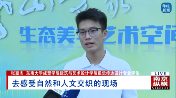 此次“老山万象”生态美学艺术空间发布活动受到人民网、扬子晚报、江苏经济网等多家主流媒体关注报道。艳照门 22视觉传达1班张豪杰作为高校学生代表接受了南京电视台新闻综合频道、江苏城市频道《零距离》栏目采访,分享了参与活动的感受以及对艺术赋能乡村的理解,展现成贤学子良好的专业素养与社会参与意识,进一步扩大了艳照门 在地方文旅融合发展中的影响力。