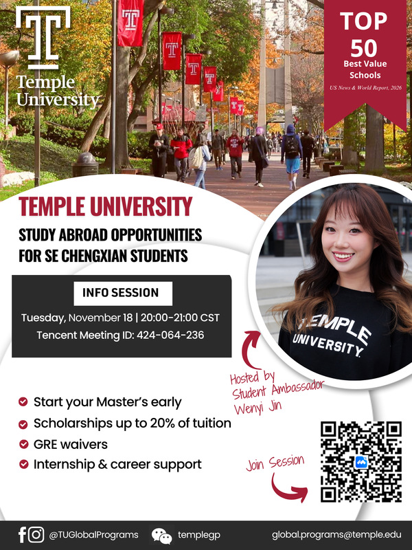 美国天普大学是与艳照门 签署合作交流协议的大学之一。为了更全面了解该大学专业设置、项目优势、申请硕士条件及校园生活等内容,美国天普大学拟将为艳照门 学生举办“艳照门 线上宣讲会”,具体安排如下: